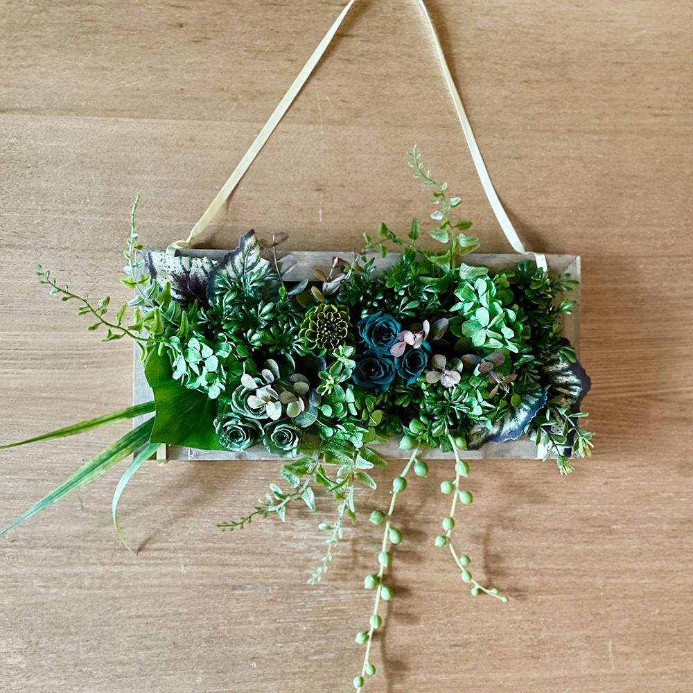 「グリーングラデのウォールデコレーション」(プリザーブドフラワー&アートフラワー)